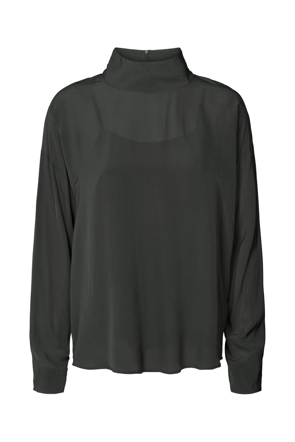 Diseñada con un corte relajado, la blusa cuenta con mangas largas, un cuello alto y una cremallera discreta en la espalda. La blusa también viene con un top a juego, que es sutilmente visible a través del material ligeramente transparente.