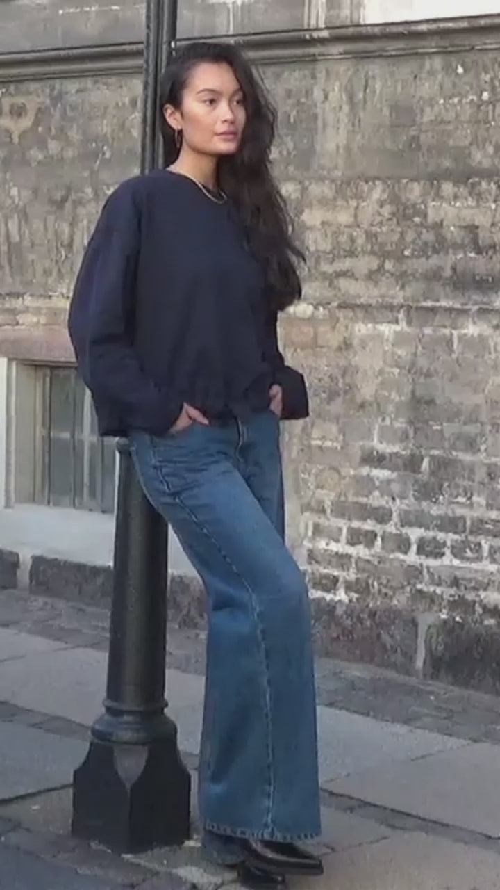 Confeccionados en un clásico tejido azul, estos vaqueros acampanados se caracterizan por una cintura regular con trabillas, cierre de cremallera, pequeños bolsillos laterales, bolsillos traseros y perneras largas y anchas.