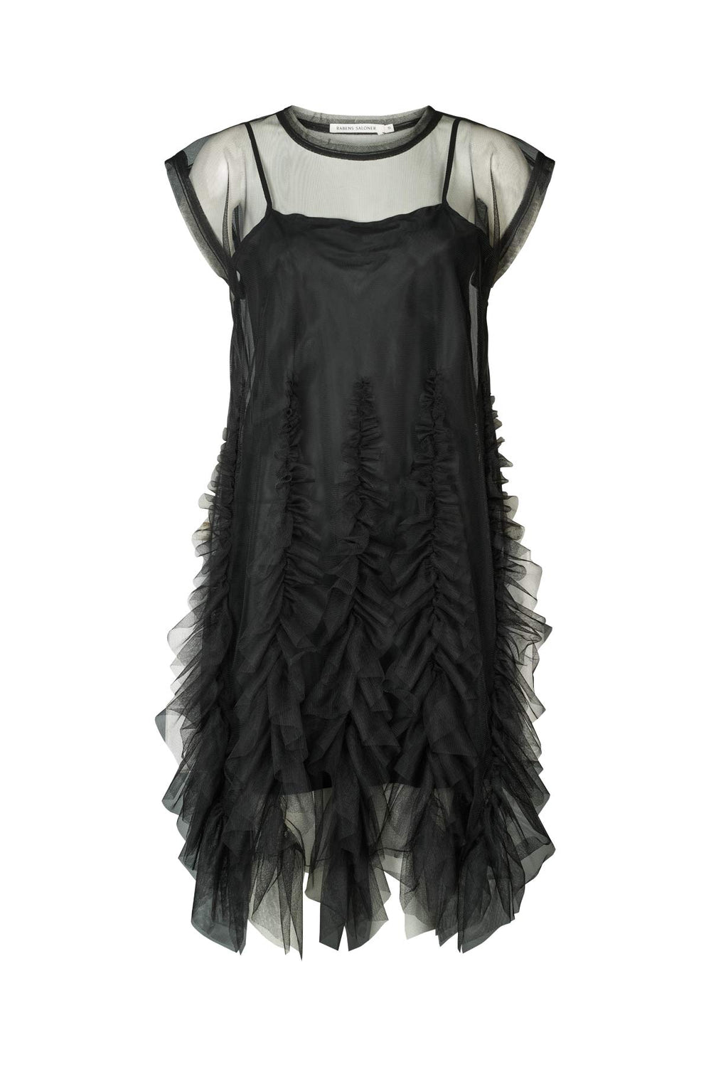 Confeccionado en un tejido ligero y translúcido, el vestido de tul es perfecto para superponer. La silueta relajada se define por mangas cortas, escote redondo y una multitud de volantes que aportan un toque de frescura y juego a la prenda.