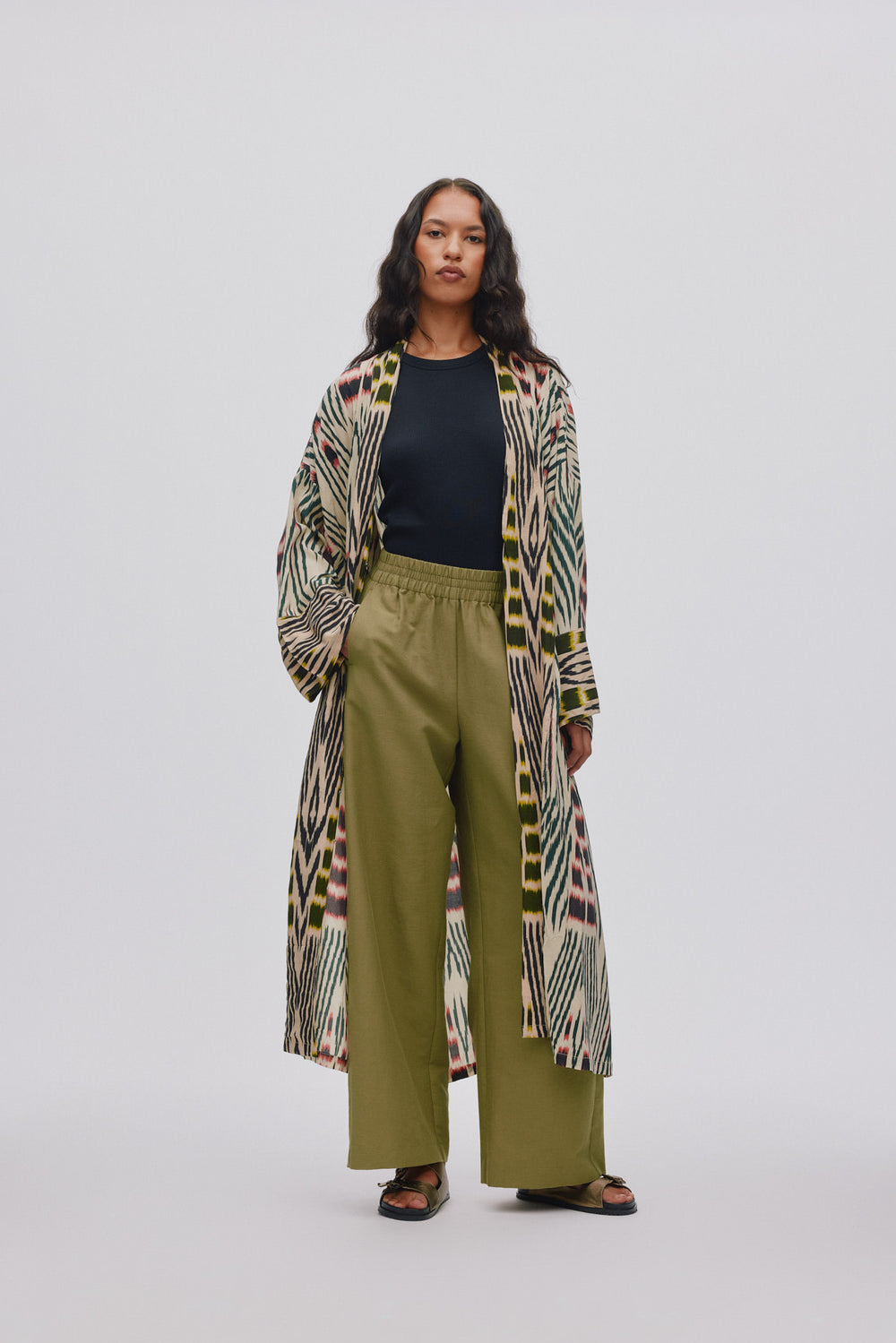 Este vestido kimono largo destaca por su estampado ikat teñido a mano, elaborado por artistas locales del color en el taller de color de Rabens en Bali. Esto aporta ligeras variaciones de color y patrón, haciendo que cada prenda sea completamente única.